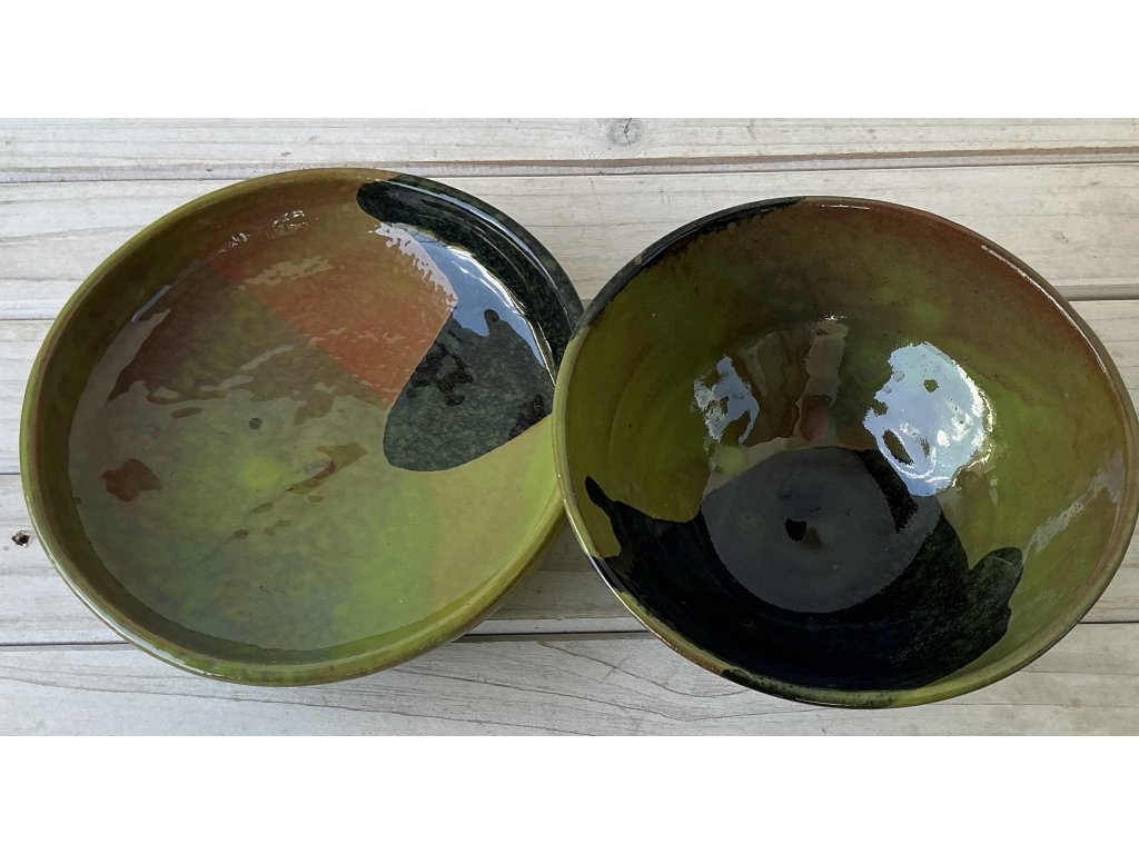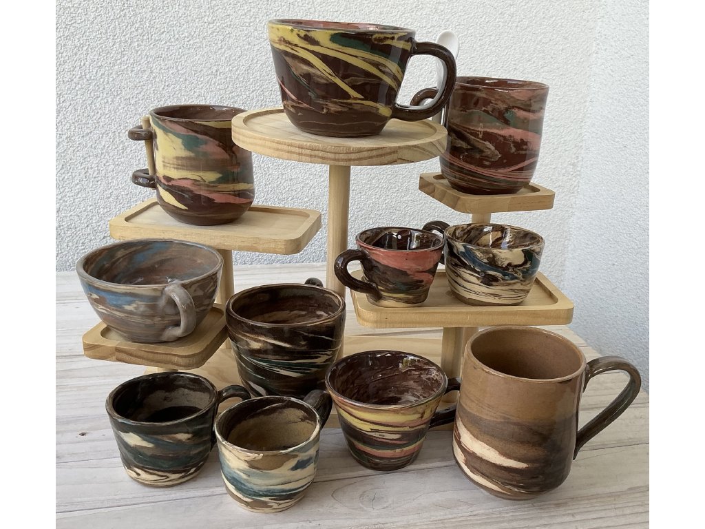 Miska a šálky zhotovené technikou spájania farebných hlín