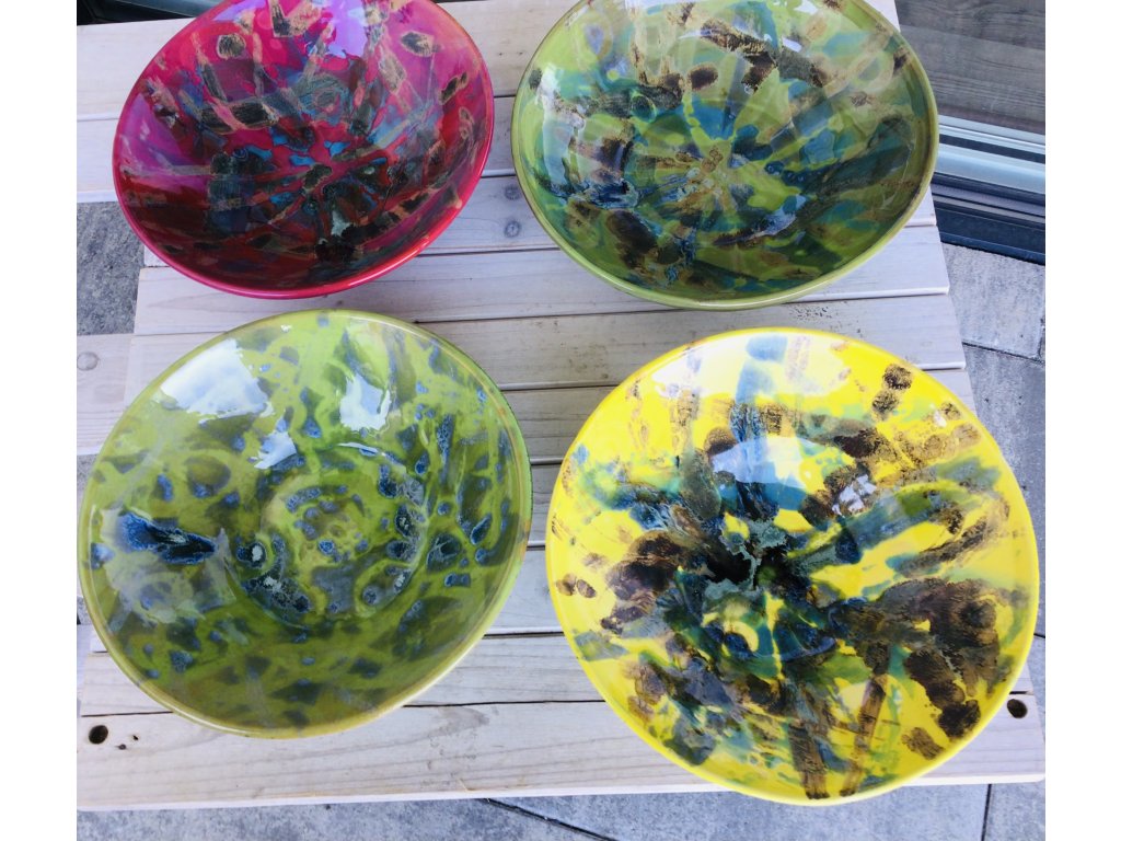 Veľké keramické misy s priemerom 25, 27, 28 cm. Misy sú vyrobené technikou kombinácie glazúry s voskom. Dvojnásobný výpal ekologickými glazúrami. Možnosť výberu zo štyroch kusov.
